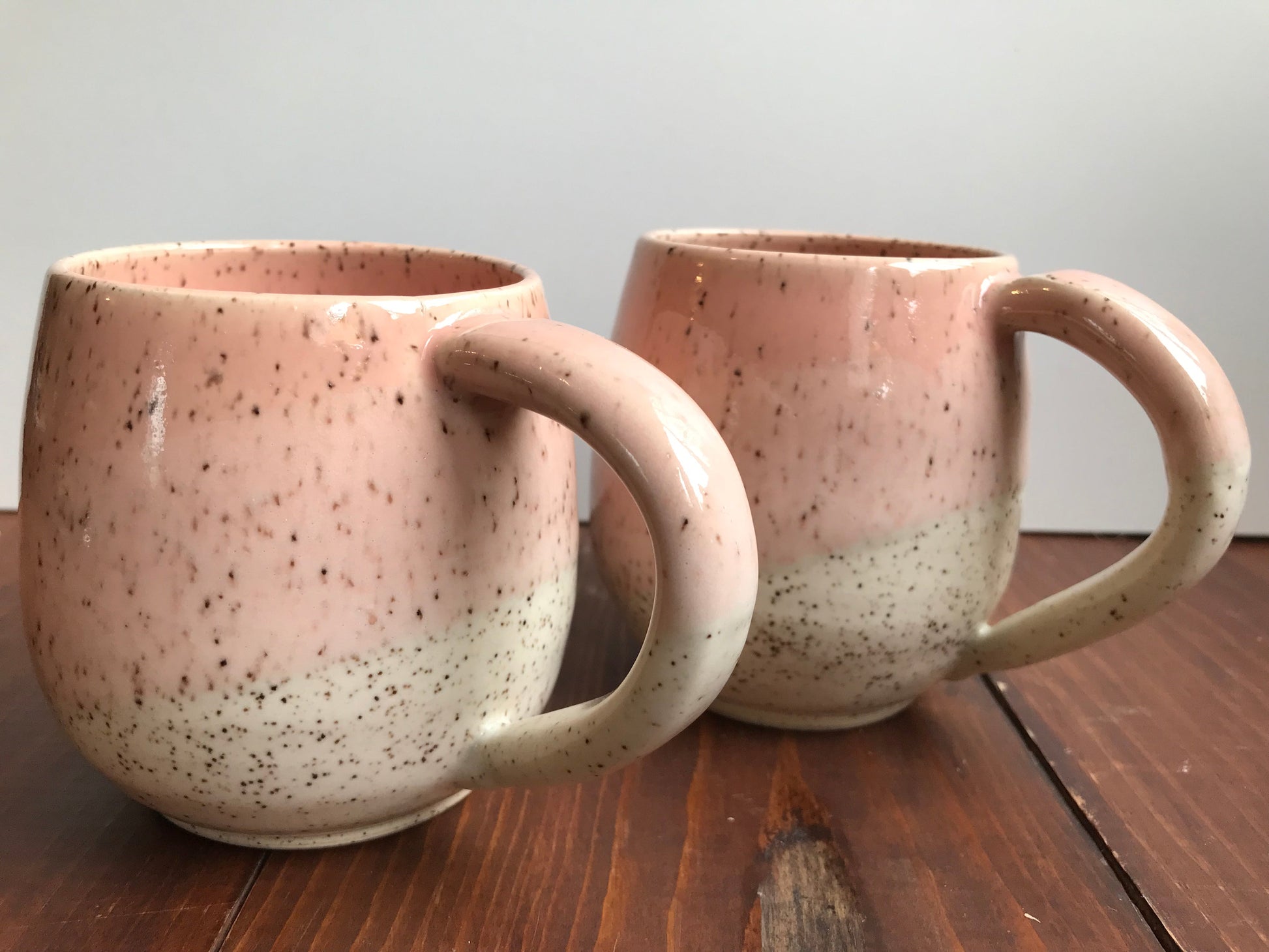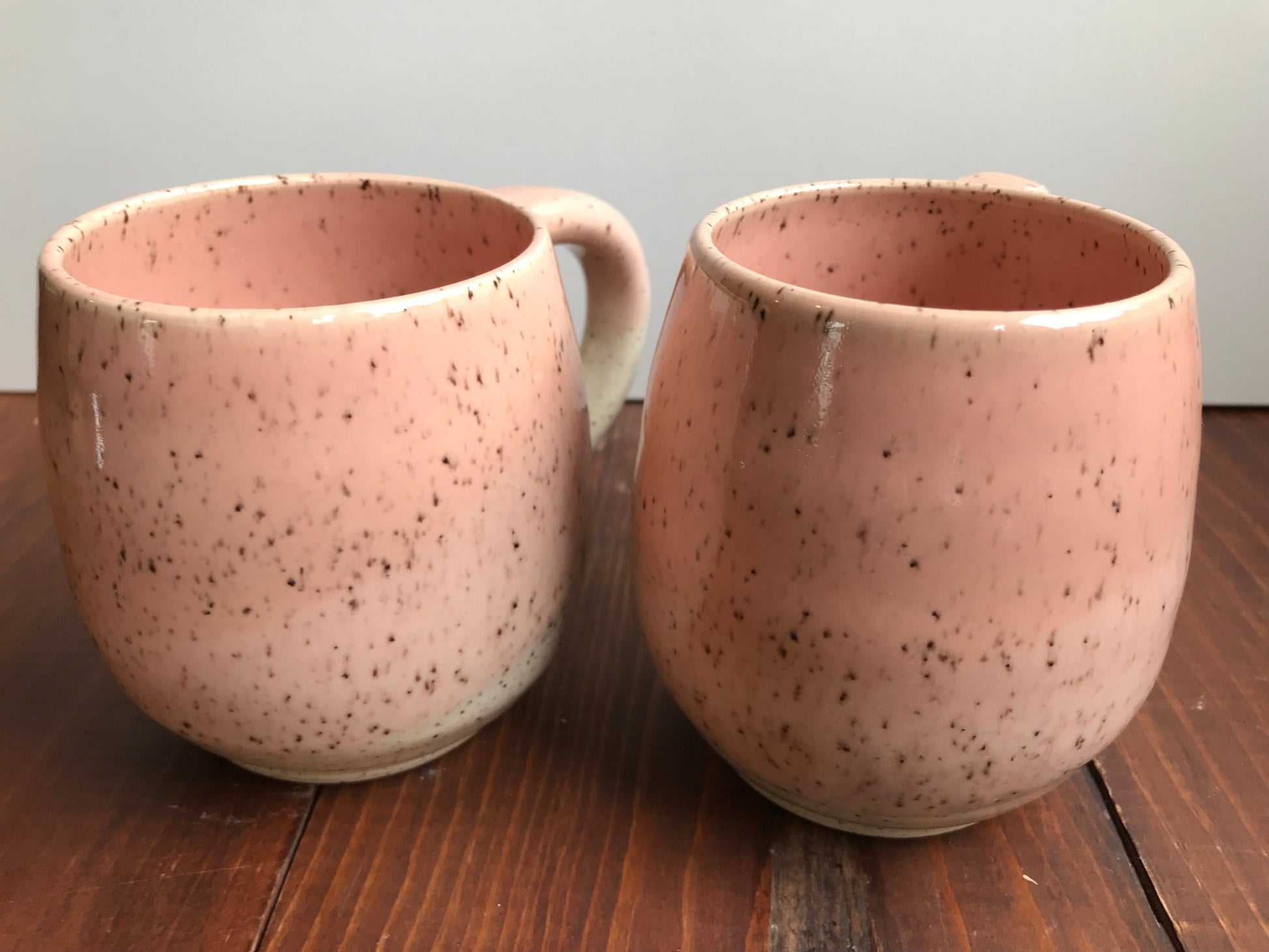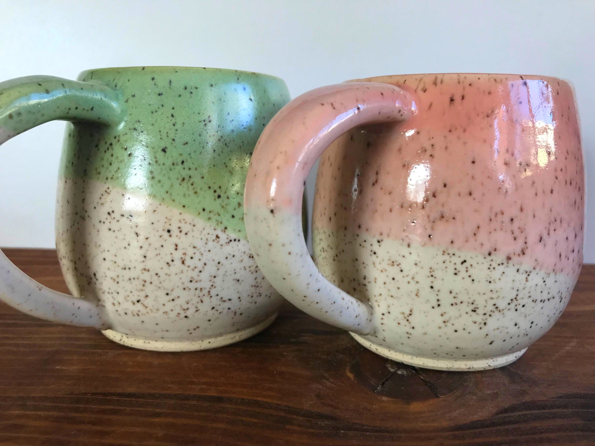 Mugs in pink or honewdew green on white speckled clay, available in 8 or 12 oz.