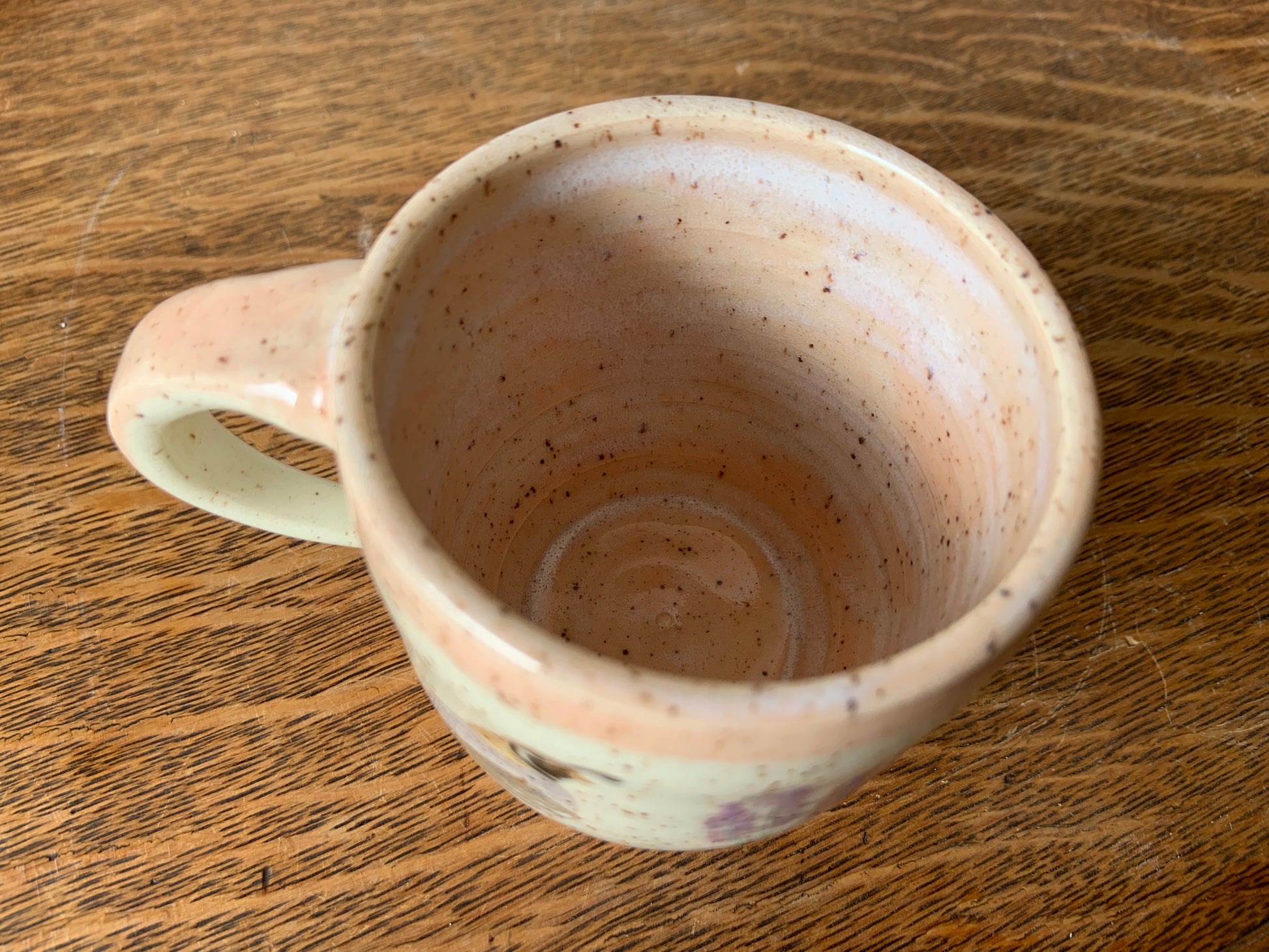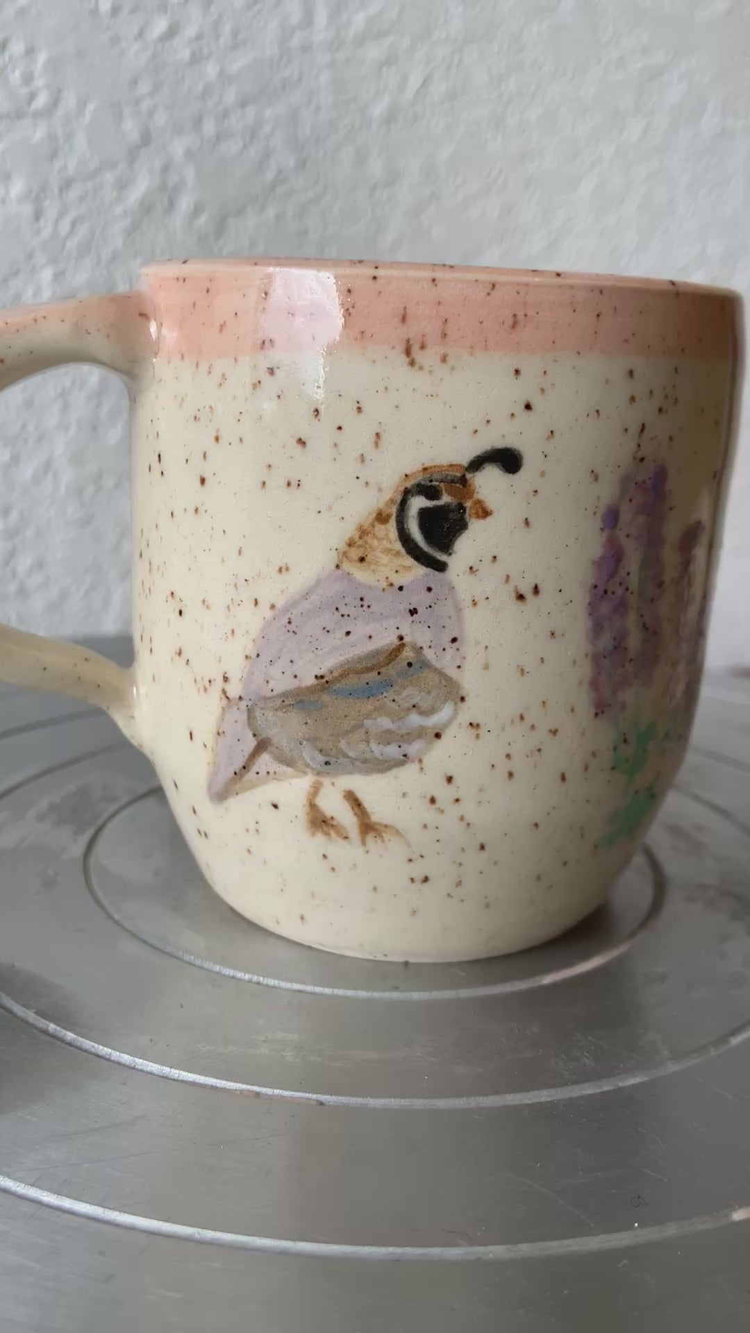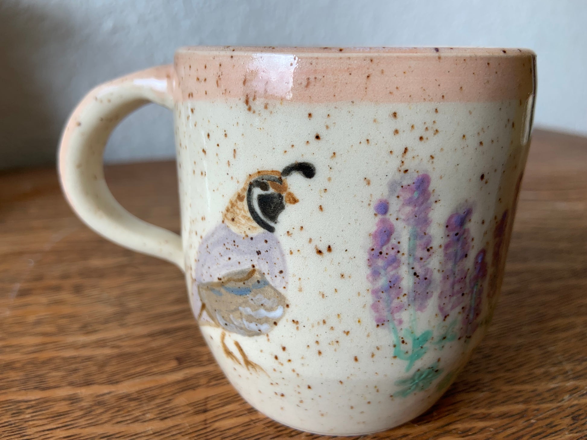 Handpainted mug with quails and lupine ,10 oz one of kind mug on speckled white clay.