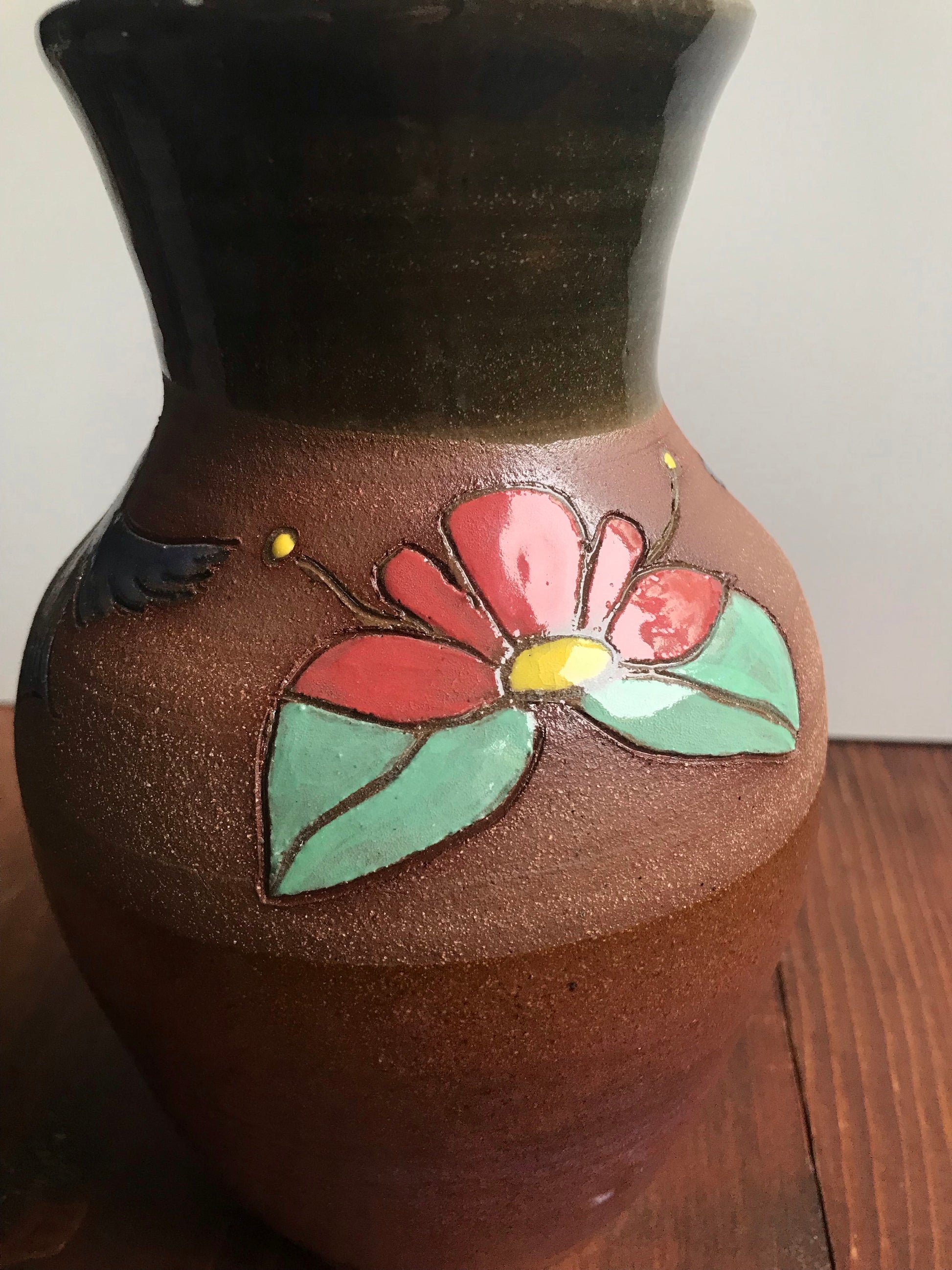 Thrown on the wheel and handpainted with flowers and hummingbirds.